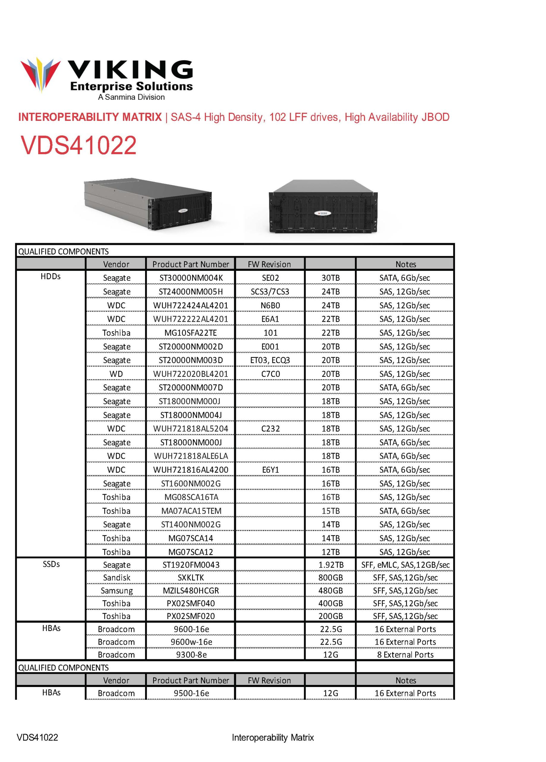 VDS41022: High-density SAS-4 JBOD data storage with 102, 3.5-inch HDDs with two active 24 Gb/s I/O modules.